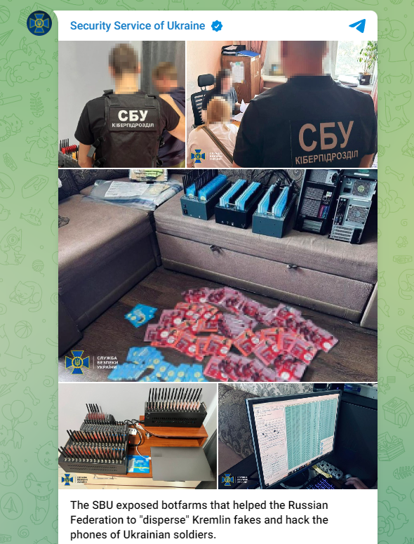 Russian bot farm operators detained: Ukrainian authorities have arrested two individuals who ran mobile bot farms. The two suspects used Ukrainian SIM cards to register more than 15,000 social media accounts and sold access to the accounts through the dark web. The Ukrainian SBU says Russian intelligence bought access to some of these accounts to spread pro-Kremlin propaganda and send smishing messages to Ukrainian soldiers.