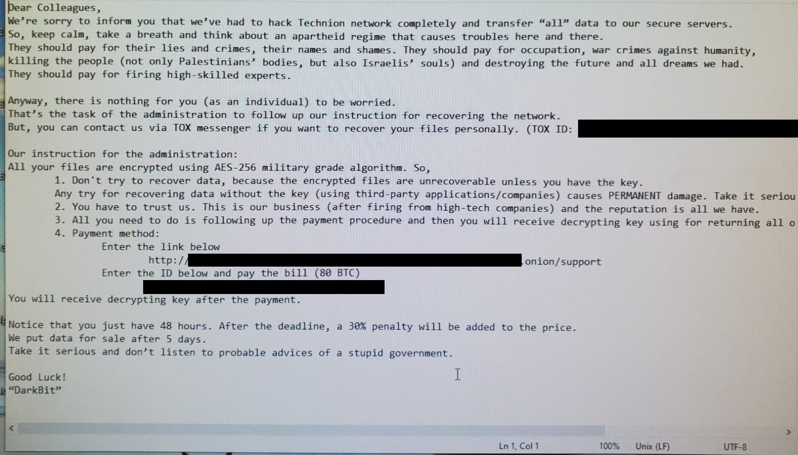 Technion ransomware attack: A ransomware gang named DarkBit has hacked and encrypted the IT systems of Israel's Institute of Technology, Technion, a public research university based in Haifa. The hackers are requesting 80 bitcoin ($1.7 million) to decrypt the organization's network, according to a ransom note shared by Israeli threat intel firm HudsonRock.