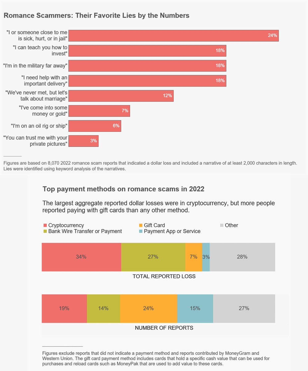 Romance scams in 2022: The US Federal Trade Commission says that more than 70,000 people reported losing money to a romance scam last year. In total, victims lost more than $1.3 billion, with $4,400 the median reported loss. Victims said they were usually approached on dating apps or via unexpected messages on social media. The scammers moved conversations to a private instant messaging service, where they asked victims to transfer money on various pretenses, either to a cryptocurrency wallet or via a bank wire transfer—the same technique they have been using for the past five years, but which still works with spectacular results. The $1.3 billion figure reported by the FTC is 35% higher compared to $956 million, the losses to romance scams reported to the FBI in the previous year, in 2021 [PDF].
