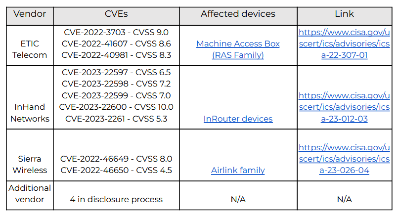 OT vulnerabilities: Otorio researchers have identified 38 vulnerabilities in the products of four vendors of WiFi equipment with industrial OT networks. Findings include vulnerabilities in the web interface and the firmware of these devices alike. Some of the vulnerabilities have been patched already, while some are still in the disclosure process. Many vulnerabilities allow RCE attacks. Affected vendors include Sierra Wireless, InHand Networks, ETIC Telecom, and a fourth still-unnamed vendor. The company plans to reveal more at the S4x23 security conference in Miami on Wednesday, February 15. More in the company's security advisory [PDF].