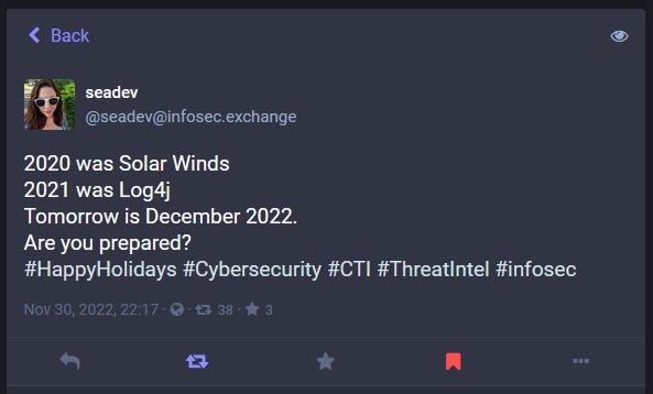 Loj4Shell anniversary: The Log4Shell anniversary will be coming this week, and most likely a new vulnerability too. That's how the month of December works in infosec. A major security disaster before everyone's winter holiday.