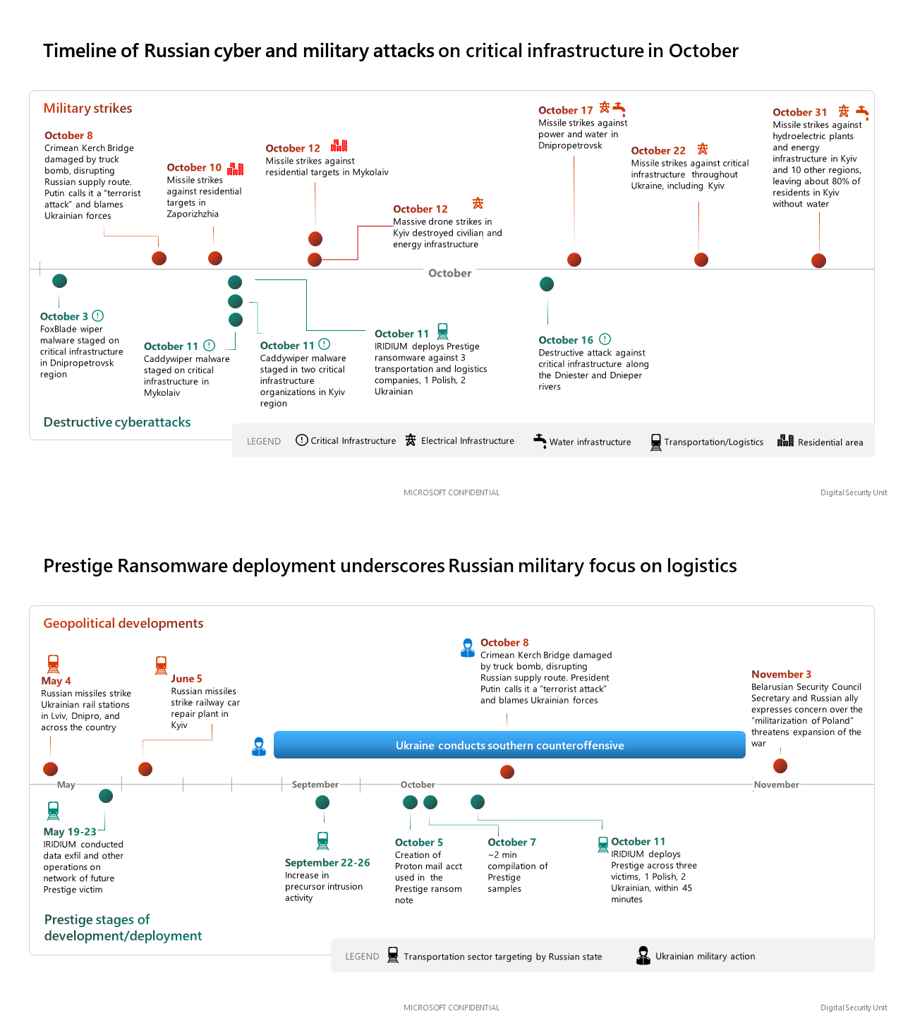 Coordination between Russian kinetic and cyberattacks: Microsoft said it is continuing to see "strong circumstantial evidence" that Russia is coordinating cyberattacks and military kinetic operations in Ukraine. In a report published on Friday, Microsoft said they saw destructive malware deployed in Ukrainian regions that were often hit by missile strikes a few days later. The report covers operations that took place in October 2022, and is the third report Microsoft published this year—after one in April and then June—where the company saw the same pattern of Russia deploying destructive malware before launching military operations.