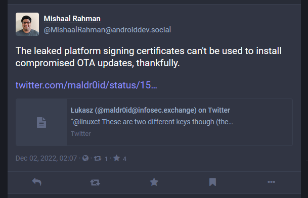 Last month, the Android Security Team found several malware samples in the wild that were signed by platform certificates used by major vendors like Samsung, LG, MediaTek, and Revoview.