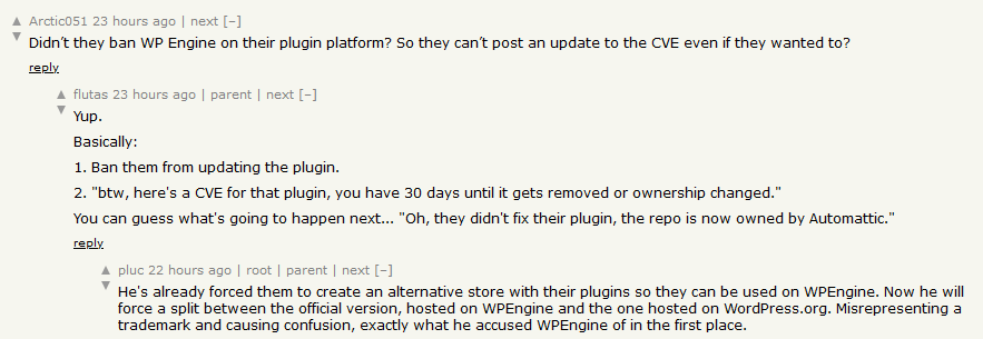 Automattic weaponizes bug disclosure: In a now-deleted tweet, Automattic has threatened to publish details about a bug in WP Engine if the company doesn't fix it in 30 days. Automattic is the owner of WordPress.com and a direct rival for WP Engine. Automattic's CEO Matt Mullenweg, has engaged in a public smear campaign of WP Engine over the past month and even used Automattic's influence over the WordPress open-source CMS to cut WP Engine's access to WordPress.org resources. More on this never-ending drama in TechCrunch.