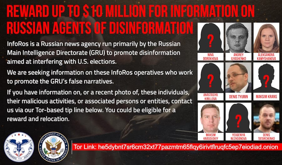 InfoRos reward: The US State Department is offering a $10 million reward for information on individuals working for Russian news agency InfoRos. Officials say the agency is secretly run by Unit 54777 of the Russian military intelligence service GRU. The unit has used InfoRos to spread Kremlin propaganda, disinformation, and meddle in the US elections. The US Treasury sanctioned InfoRos in March 2022, shortly after Russia's invasion of Ukraine.