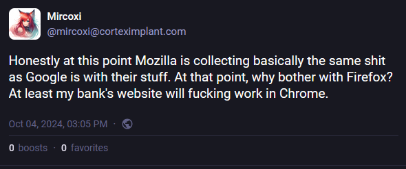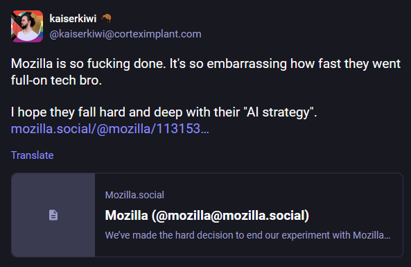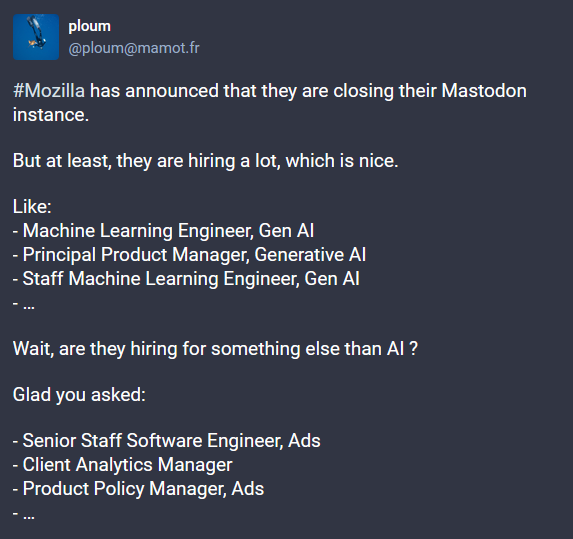 Mozilla announces move to advertising business: Mozilla has announced a major pivot from its browser to the online advertising business. This shift has been noticeable for a while, such as the organization laying off browser engineers and hiring AI and advertising people, adding ad-related settings and enabling them by default, or buying ad-related startups. It's only a matter of time until they sabotage ad-blockers in their browser, just like Chrome did.