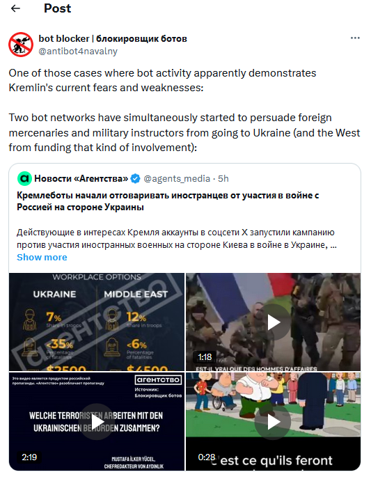 New Russian disinfo targets foreign mercenaries: Two Russian bot networks are running disinformation campaigns designed to deter foreign mercenaries and military instructors from helping the Ukrainian army. The two networks are using videos claiming that Russian forces execute mercenaries on the spot, that Russian businessmen are paying bounties for their heads, and that mercenaries fighting for Ukraine die due to poor training and lack of weapons. The two campaigns have been active on Twitter and have received more than 2.2 million views, being one of the most popular Russian disinfo operations in a while. [Additional coverage in Agents Media]