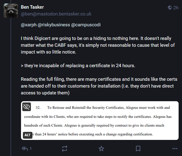 Regardless of how this plays out in court, there are some real lessons to be learned here by the CA/B Forum about emergency 24-hour certificate revocations—namely, that special rules and deadlines need to be made available for critical infrastructure operators. It's one thing to revoke a school's TLS certificate, it's another thing to revoke the certificate of a 911 call center's dashboard or an emergency reporting backend used by the water sector.