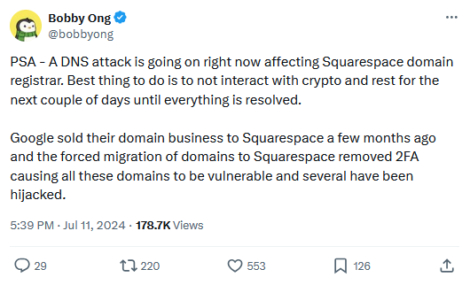 Since the first attack, cryptocurrency experts have compiled lists of crypto-related domains that are hosted on Squarespace. They are recommending that users don't access these sites until admins confirm they secured domains and enabled MFA on their Squarespace accounts.