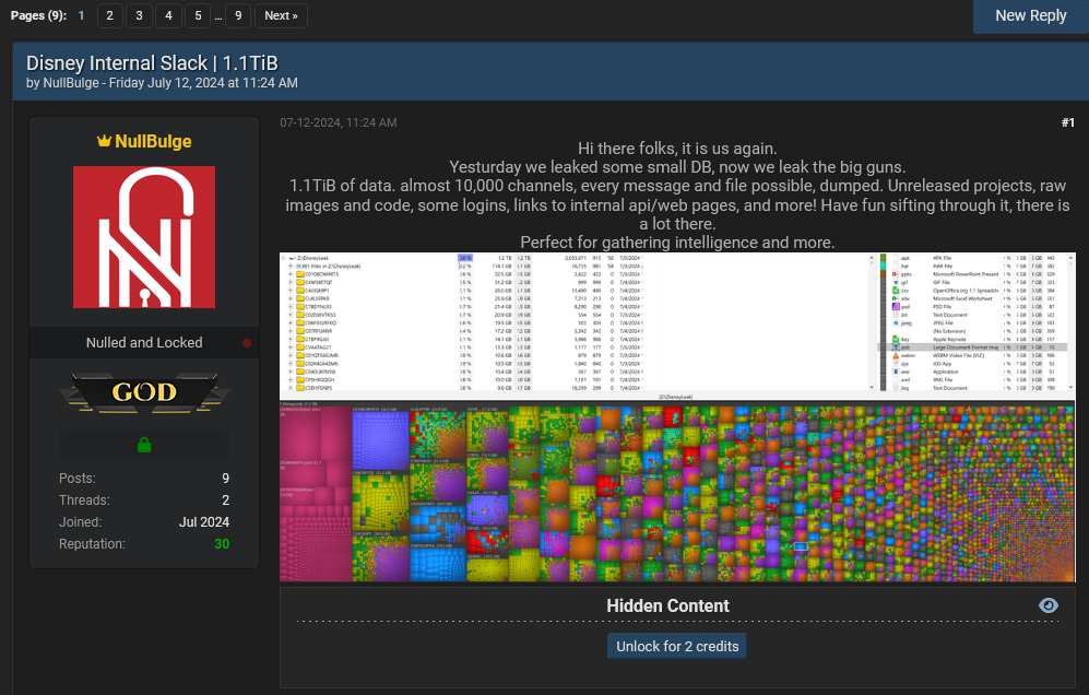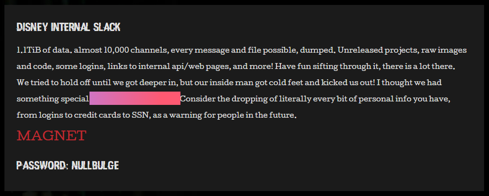 Disney hack: A hacktivist group named NullBulge has leaked more than 1.1 TB of data from Disney's internal Slack channel. The data was leaked on hacking forums and the group's official website. It allegedly contains unreleased projects, concept art, login details, and personal data. Some of the leaked data has been confirmed as authentic by both fans and gaming news sites. NullBulge says it leaked the data in response to Disney's unfair treatment and compensation of its writers and artists. According to a post on its website, the group claims it had help from a Disney employee. [Additional coverage in GameRant]