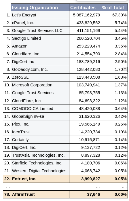 Entrust distrust stats: Google is scheduled to distrust Entrust-issued certificates inside Chrome at the end of October this year. According to Censys stats, Entrust is the 22nd-largest certificate authority on the internet.