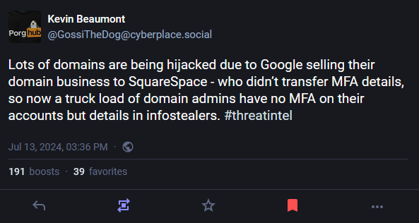 The research team says domains migrated from Google Domains to Squarespace had their MFA disabled as a technical measure to prevent admins from being locked out of their accounts after the migration.