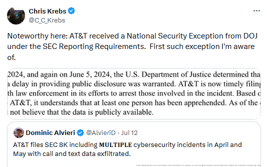 AT&T mega breach: US wireless carrier AT&T has disclosed a major security breach that impacts almost all of its cellular customers. The company says a hacker stole phone call and text message records from one of its cloud storage accounts. The breach took place in mid-April and AT&T confirmed to TechCrunch the incident is related to the larger Snowflake hacking spree. Wired reports that AT&T paid a $370,000 ransom to the hacker to delete the stolen data. A source has told 404 Media that an American man named John Binns is allegedly responsible for the hack. Binns previously also hacked T-Mobile in 2021. He was detained by Turkish authorities in late May and is currently facing extradition to the US.