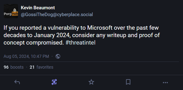 Windows downgrade attack: Security firm SafeBreach Labs has discovered two vulnerabilities in the Windows operating system that can allow threat actors to downgrade OS components to vulnerable versions. The vulnerabilities reside in the Windows kernel (CVE-2024-21302) and update (CVE-2024-38202) functions. The issues were presented at the Black Hat security conference this week. Microsoft has acknowledged both issues and is scheduled to release patches next week.
