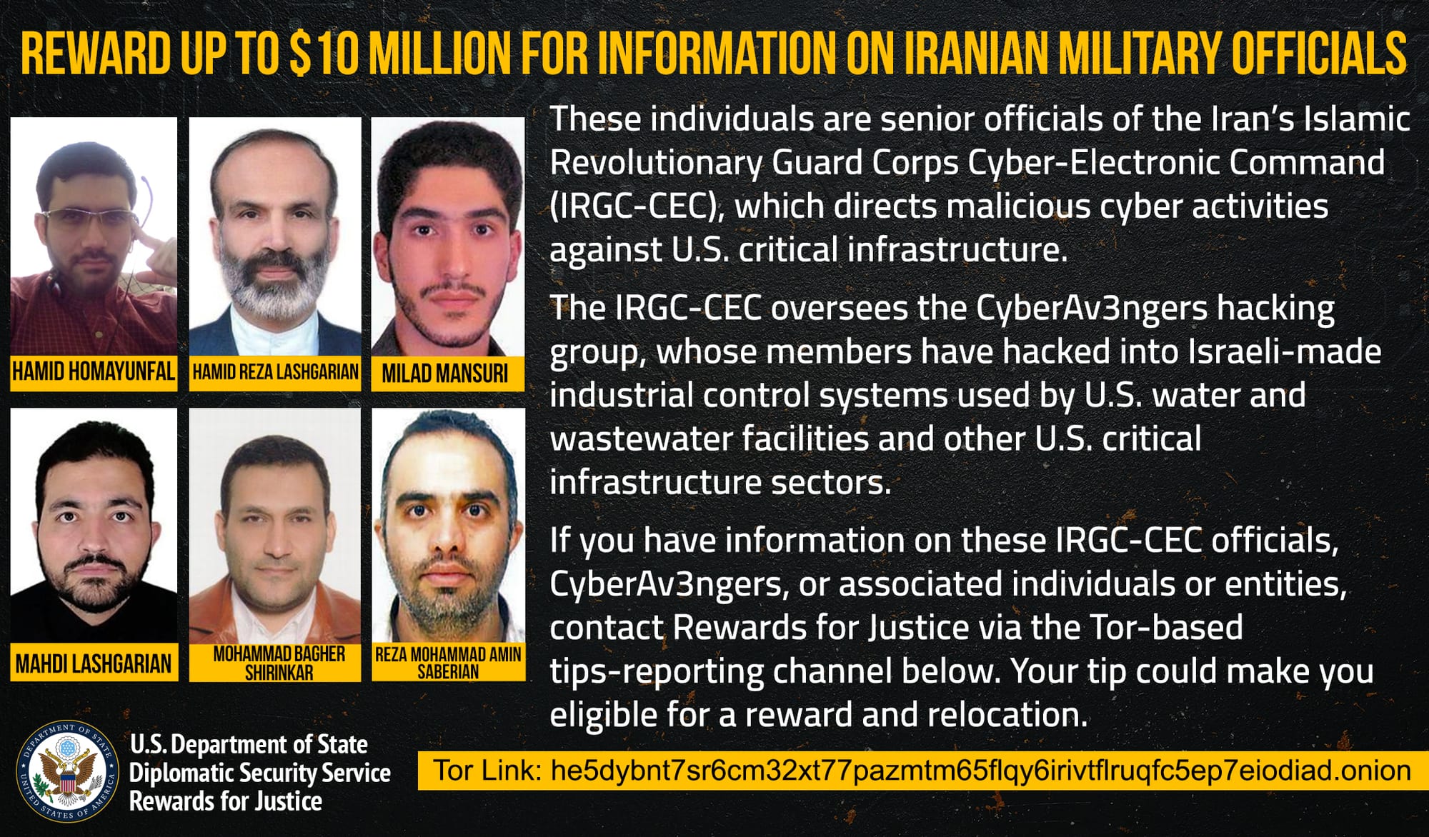 The US State Department is offering a $10 million reward for any information on six Iranians behind Cyber Av3ngers, an Iranian hacktivist group that has repeatedly attacked critical infrastructure across the US and other countries.