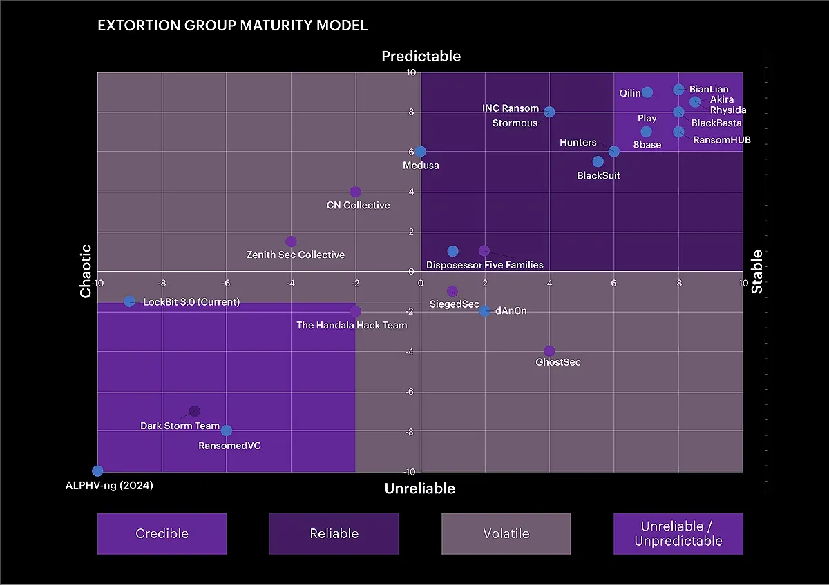 New tool—EGMM: Accenture has developed a new Extortion Group Maturity Model (EGMM) that assesses the credibility and stability of ransomware and data extortion groups.