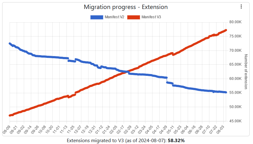 Chrome extension migration lagging behind: Chrome extension developers have migrated only 58% of Chrome extensions to the browser's new Manifest V3 extension framework. Google has recently started showing visible warnings to users still using extensions built on the older Manifest V2 framework. Based on recent stats, Google is set to purge more than 55,000 older Chrome extensions from its Web Store..