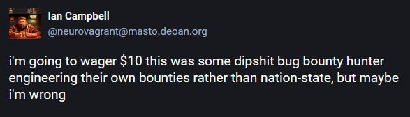 But this wasn't it. Besides sockpuppet accounts to pressure Collin, Jia Tan worked hard for his backdoor in other places as well. He apparently made a pull request on Google's OSS-Fuzz project to blind it to its backdoor, and pressured Fedora and Ubuntu devs to update to the backdoored versions.