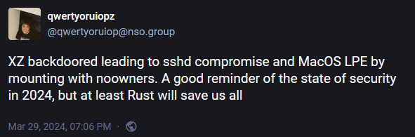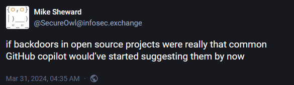 Developer response: Lasse Collin has confirmed the incident here. The XZ Utils project was down at the time of this newsletter because it was primarily hosted via GitHub. GitHub pulled the project for security reasons to prevent its code and tarballs from being pulled into other projects. It also suspended Collin and all maintainer accounts, probably not knowing if they were compromised or not. Better to be safe than sorry.