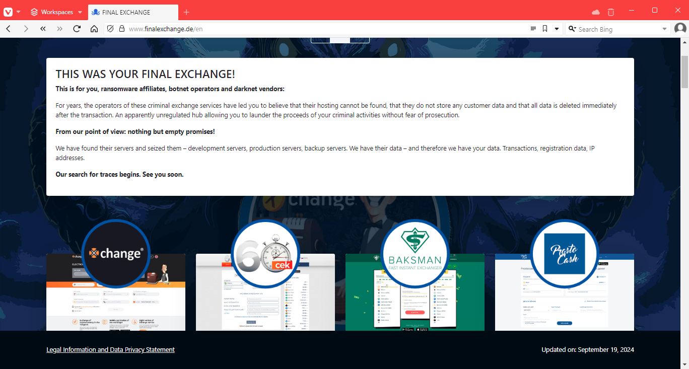 Operation Final Exchange: German law enforcement has shut down 47 cryptocurrency exchanges involved in laundering cybercrime proceeds. Officials say the services knowingly failed to implement anti-money laundering provisions, such as Know Your Customer requirements. German authorities say users of the seized services included ransomware groups, darknet traders, and botnet operators. The largest of the seized sites is Xchange.cash, which had more than 410,000 users before it was shut down.