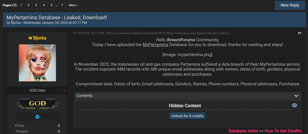 MyPertamina leak: Indonesian authorities are investigating a breach of the MyPertamina digital financial service. A threat actor leaked the company's data online on a hacking forum in January this year. Officials have started an investigation nine months after the leak, only after the personal data of the country's president and his family was shared online. More than 6 million Indonesians are believed to have had their personal and tax ID numbers stolen in the MyPertamina hack. [Additional coverage in The Star]