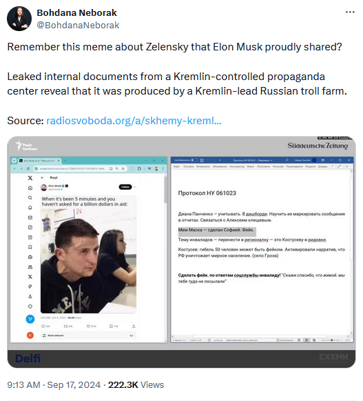 Russian disinfo leak: OCCRP reporter Martin Laine analyzes a leaked database of past fake comments posted by Russian trolls online. The comments come from the Social Design Agency, or SDA, which was recently exposed and sanctioned by US authorities. In one of the leaked SDA internal documents, SDA employees rejoiced when Elon Musk retweeted one of their memes.