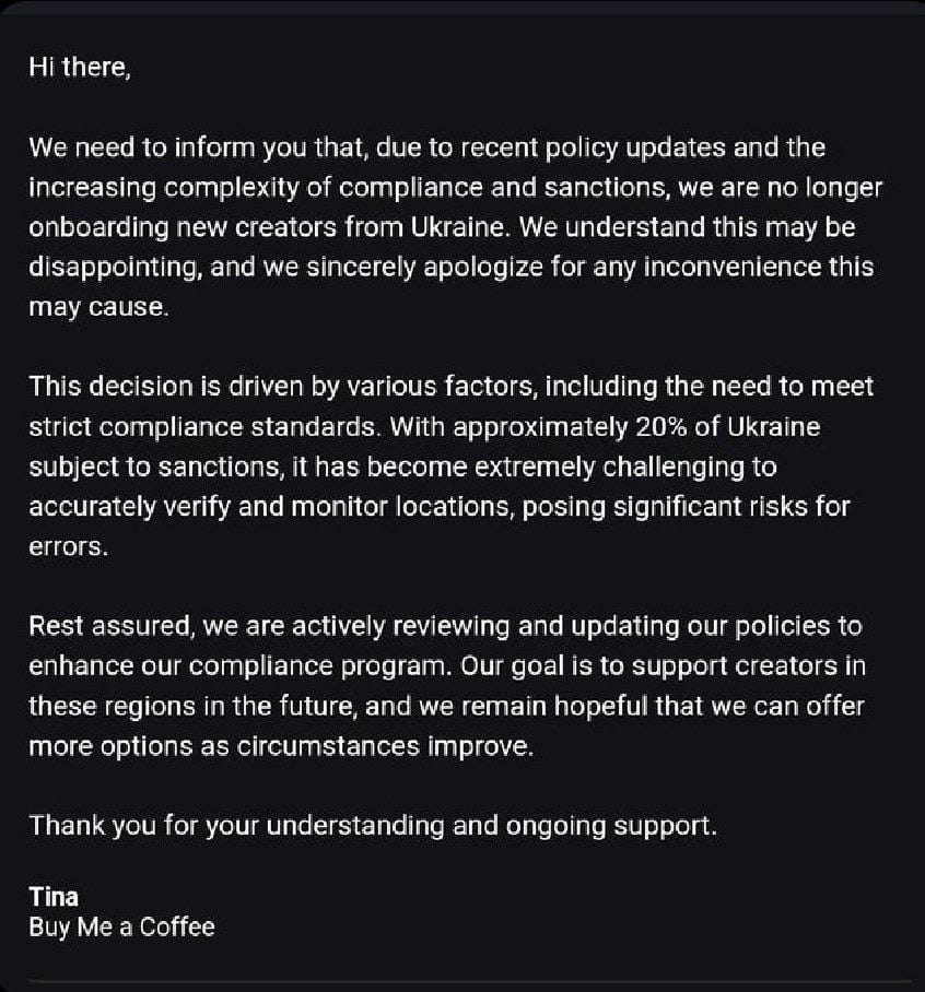 Buy Me a Coffee leaves Ukraine: Donation service Buy Me a Coffee is leaving Ukraine citing problems with following sanctions imposed on some of the Russian-conquered parts of Ukraine. The company says it's getting harder to tell which users in Ukraine are living where and if they are subject to sanctions.