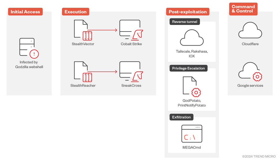 Earth Baku (APT41): Trend Micro looks at how Chinese APT group Earth Baku has recently expanded operations from the Pacific region to Europe, Africa, and the Middle East. The attacks have used public-facing applications such as IIS servers as entry points. The group then deployed advanced malware toolsets such as the Godzilla webshell, StealthVector, StealthReacher, and SneakCross.