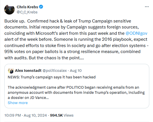 "These documents were obtained illegally from foreign sources hostile to the United States, intended to interfere with the 2024 election and sow chaos throughout our Democratic process. On Friday, a new report from Microsoft found that Iranian hackers broke into the account of a ‘high ranking official’ on the U.S. presidential campaign in June 2024, which coincides with the close timing of President Trump's selection of a vice presidential nominee."