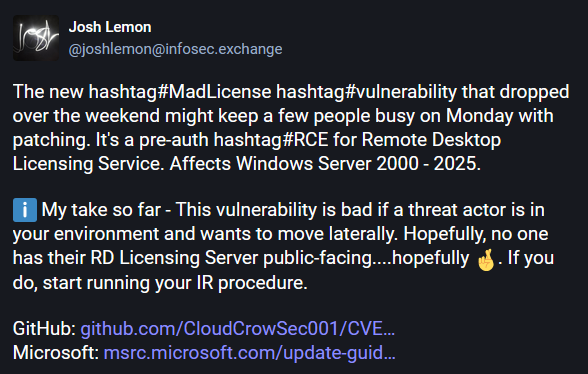 RD Licensing exploit: A public PoC is now available for CVE-2024-38077, an RCE in the Windows Remote Desktop Licensing server that Microsoft patched last month. The bug has been named by its researchers MadLicense and affects all known versions of Windows Server. [h/t ScreamingGoat]