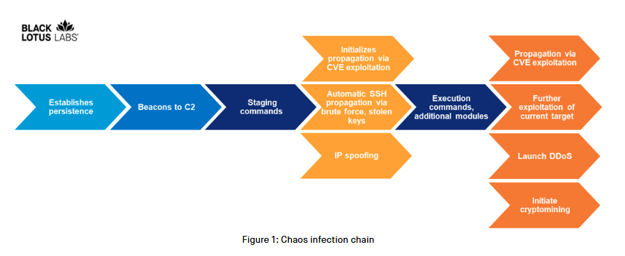 Chaos botnet: Lumen's Black Lotus Labs said they identified a new Go-based malware strain named Chaos that has spent the past few months infecting Windows and Linux servers worldwide, including many SOHO routers. According to current evidence, the main purpose of this new malware appears to mine cryptocurrency for its operator(s) and launch DDoS attacks.