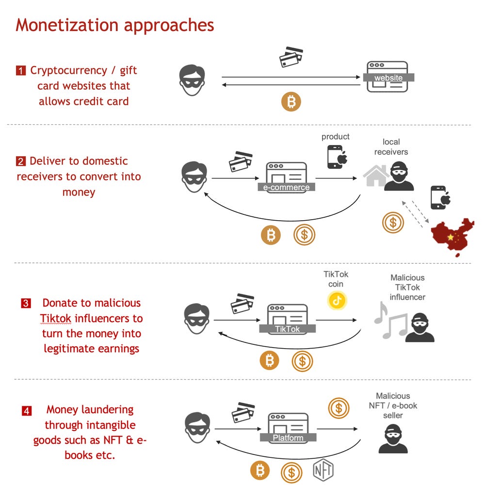 TikTok's role in money laundering: AT&T has a report on the methods employed by Chinese threat actors to launder funds stolen from Western victims. Observed monetization techniques include classic cash-out schemes where the threat actors use the stolen funds to purchase gift cards or expensive real-world products that are later resold, allowing the threat actors to lose their money trails. Newer monetization techniques also involve buying and reselling e-books and NFTs, but also TikTok coins. In the case of TikTok, the threat actors will buy TikTok coins and donate them to a malicious TikTok account. This account is either run by the threat actor or a recruited "influencer" who takes a cut of the coins and sends the rest back to the gang.