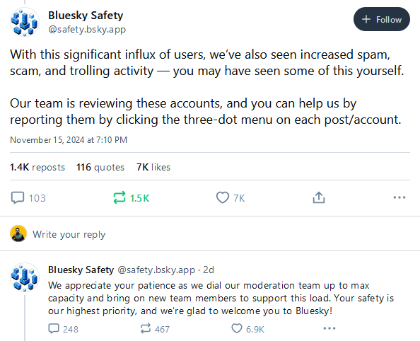 BlueSky trolls and spam: After reaching 18 million users and growing about 1 million new users per day, BlueSky says it's now seeing an influx of spam, scam, and troll accounts. 'twas to be expected!