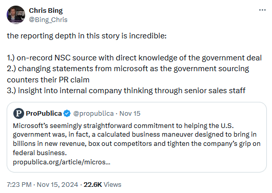 The US' Microsoft dependency: A ProPublica investigation looks at how Microsoft offered the US government free cybersecurity upgrades in 2021 and ensnared the US government IT apparatus into its closed ecosystem, making it harder to switch to other solutions due to high migration costs.