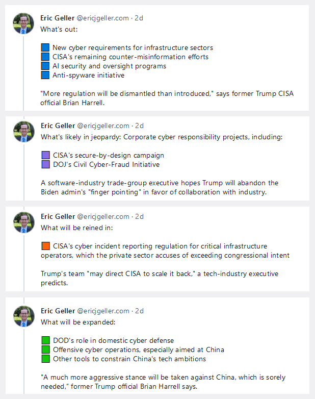 Predictions for Trump's cyber stance: WIRED interviewed Brian Harrell, former CISA assistant director during the first Trump presidency, about the upcoming administration's future cyber positions. Harrell sees more aggressive actions against China's hacking operations, a rollback of the White House's anti-spyware efforts, and an elimination of CISA's counter-misinformation efforts. [Plus more, see article or image below]