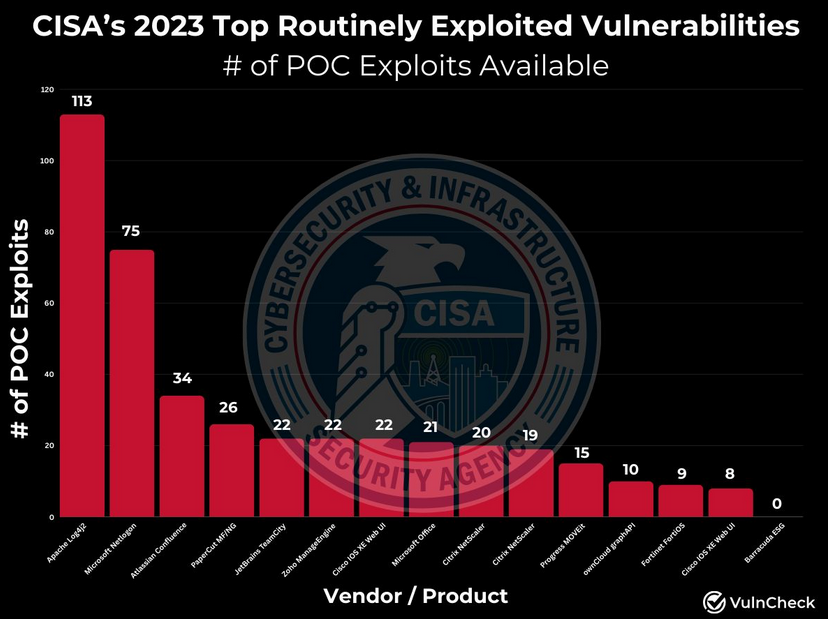 POC availability for most exploited vulns: VulnCheck's Patrick Garrity looks at the number of publicly available POCs for the CISA Top 15 most frequently exploited vulnerabilities of 2023. Only one vulnerability was exploited at scale last year that did not have a public PoC.