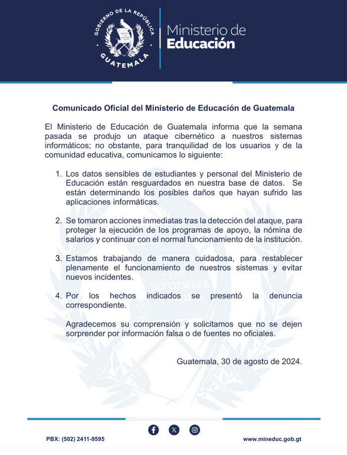 Guatemala MoE cyberattack: Guatemala's Ministry of Education says it was the victim of a cyberattack on some of its IT systems. Officials are still investigating last week's attack and if any data was stolen or compromised.