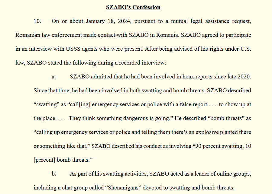 Throughout the years, and especially in late 2023, Szabo and Radovanovic organized swatting events against a former US president, members of Congress, state governors, federal officials, and members of US law enforcement agencies.