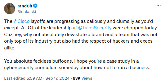 Cisco Talos layoffs: Cisco has laid off thousands of employees in its second round of layoffs this year. The company announced in August plans to lay off around 7% of its workforce (~5,500) as it refocuses on security, cloud, and AI. Despite its refocus on security, the layoffs also hit its Talos security division. [Additional coverage in TechCrunch]