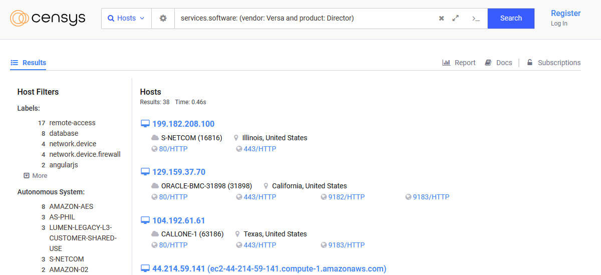 According to Censys, there are around only 150 Versa Director servers exposed online, but what's hiding behind those things is an intelligence gold mine. Ok... there were around ~150. They're now only 38 when we took this screenshot. People are either patching or putting those things behind firewalls. Message received, I guess.