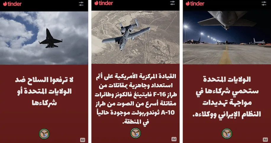 US runs Tinder ads: The US military has used ads on the Tinder dating platform to warn Middle East residents against taking up arms against the US and its partners. The campaign used photos of F-16 and A-10 aircraft "currently in the region." Tinder removed the ad after the Washington Post reached out for comment. The Pentagon declined to comment, saying it generally does not discuss information operations.
