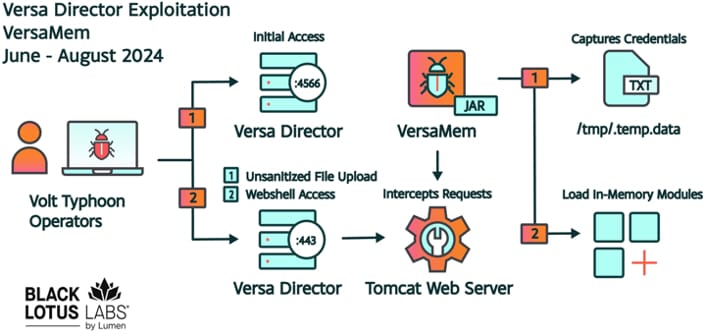 Lumen says Volt Typhoon used a zero-day (CVE-2024-39717) to upload a malicious web shell on a target's Versa Director server. Lumen named this web shell VersaMem because it ran in the server's memory to avoid detection and leaving clues of a hack on the device's disk.
