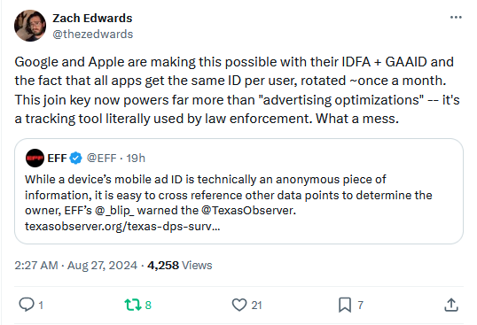 Texas police surveillance: The Texas Department of Public Safety (DPS) has signed a five-year contract for Tangles, an AI surveillance tool that can track cell phone movements. The deal has alarmed privacy advocates as the tool can be used to track phones with data for which court orders are not typically required. This includes location data and user IDs acquired from online advertisers and other data brokers. According to the Texas Observer, the tool will be deployed for the use of the Texas State Police. The Tangles contract is worth $5.3 million over five years and is one of the Department's largest.