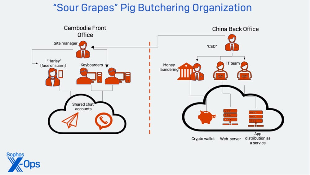 Sour Grapes group: Sophos researchers have uncovered a threat actor they are naming Sour Grapes that has made more than $3 million in cryptocurrency over a period of five months via pig-butchering scams. Pig butchering is a relatively new term that is used to describe a type of scam where threat actors approach victims on dating sites and move conversations to financial topics, trying to lure victims into making various financial or cryptocurrency investments. Sophos says the group operates from offices located in Cambodia, but its leadership is based in China. The gang's membership includes a young man or woman who act as the face of the scam, "keyboarders" who keep the victim engaged in text chats, and a team that generates media content to support various fabricated backstories.