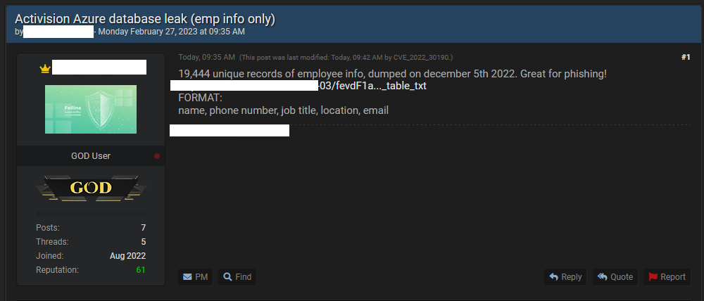 Activision data leaks: The data of thousands of Activision employees has been dumped on a hacking forum. The data originates from a hack that took place in December of last year. Activision confirmed the breach last week after hackers leaked details about upcoming content in the Call of Duty franchise. The leak of employee data comes to contradict Activision's initial statement in which the company claimed that only game-related content was stolen and that no employee or user data was exposed.