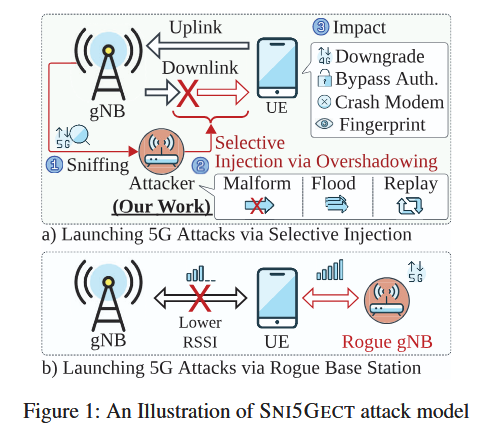 "While this approach requires Sni5Gect to sniff the UE [user equipment] starting from the 5G registration procedure, it is highly practical since many common events can cause a phone to lose signal, resulting the UE to perform re-connection: Users (i) entering and leaving a lift which temporarily breaks mobile connectivity, (ii) arrivals in the airport (toggling of airplane mode), (iii) passing through a long tunnel or an underground parking garage where signal is completely lost. Consequently, an attacker located nearby such places could easily exploit the UE communication window even without using selective 5G jamming techniques."