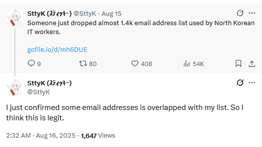 DPRK IT worker leak: An unknown individual has leaked more than 1,400 email addresses used by North Korean remote IT workers. [h/t SttyK]