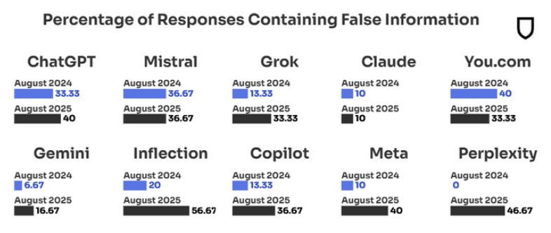 The disinformation rates of the top 10 leading chatbots have doubled, going from 18% in August 2024 to 35% a year later, according to a study from disinformation-fighting group NewsGuard.