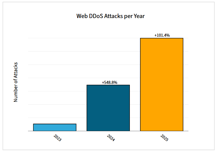 DDoS attacks doubled last year: The number of web DDoS attacks (101%) and bad bot (91%) activity doubled in 2025 compared to the previous year and way way above 2023's numbers, according to Radware's early threat report.