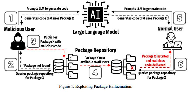 "Our findings reveal hat that the average percentage of hallucinated packages is at least 5.2% for commercial models and 21.7% for open-source models, including a staggering 205,474 unique examples of hallucinated package names, further underscoring the severity and pervasiveness of this threat."